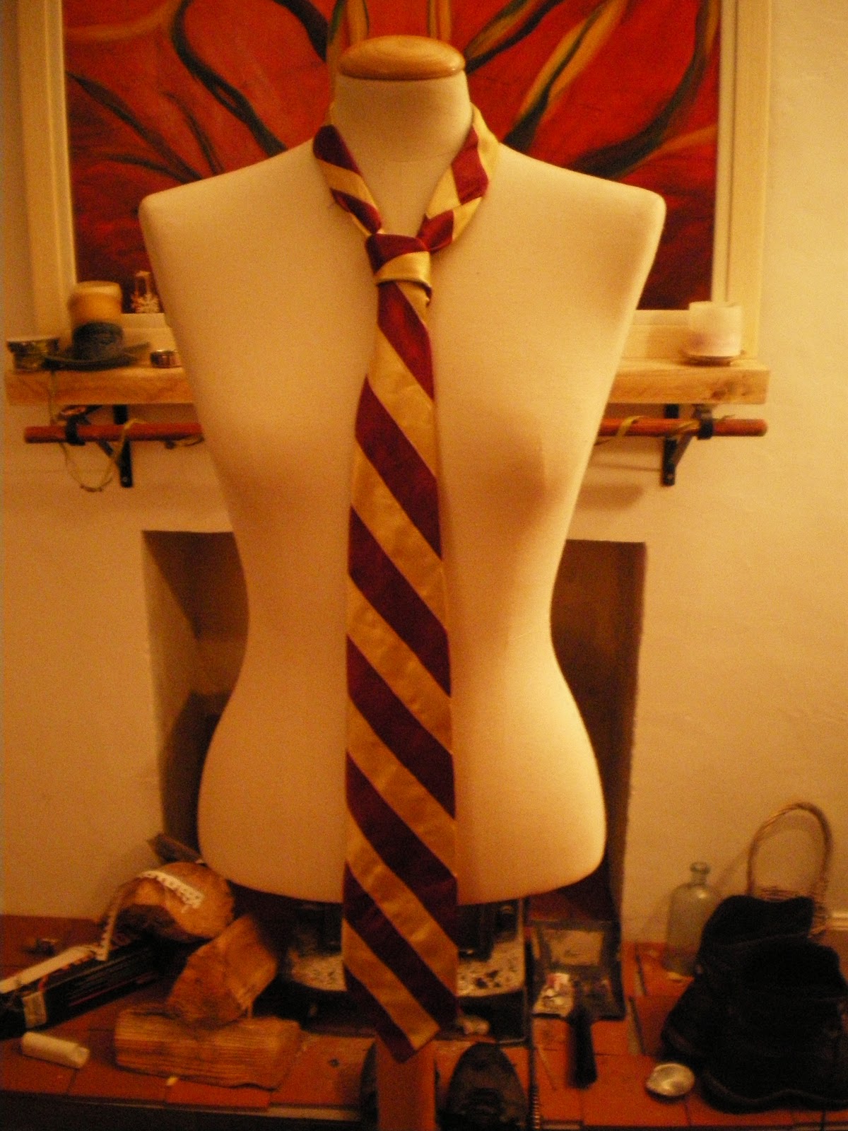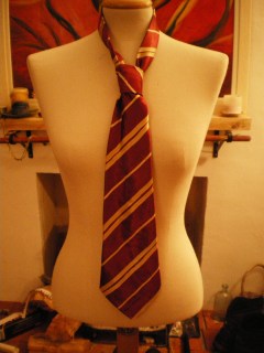 To finish the costume I made a couple of ties. My first attempt with making a tie was in the style of the first two movies. Using an old tie from my dad’s collection I took a pattern and cut it out in dark red/scarlet satin. I then stitched gold ribbon across it by machine. I then hand stitched it all back together.