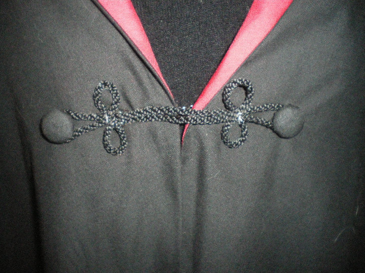 To make the closures, I fitted a small hook-and-eye closure to the inside of the robe, used a DIY covered button, covered with left over black fabric and black cord to make a frog.