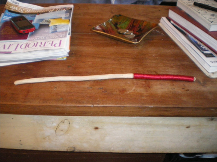 To finish everything off I made a wand for myself. This is my second attempt, the first I made of willow which I whittled, then stained with ink and varnished. The handle was wrapped in leather thonging. For this one I used a piece of hazel which I whittled then varnished, the handle is wrapped in red ribbon.